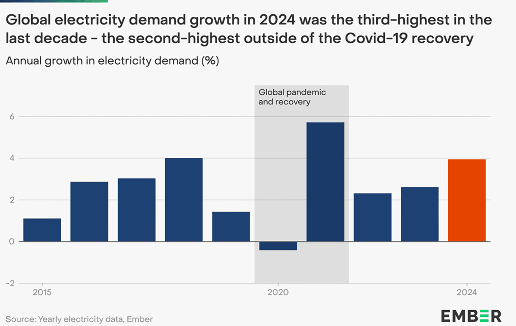 I 2022 økte etterspørselen med 2,6 prosent, i 2023 med 2,3. Ifølge Ember ble økningen i 2024 større enn de to tidligere årene ikke minst på grunn av de kraftige hetebølgene. Og hetebølger innebærer mer bruk av aircondition.