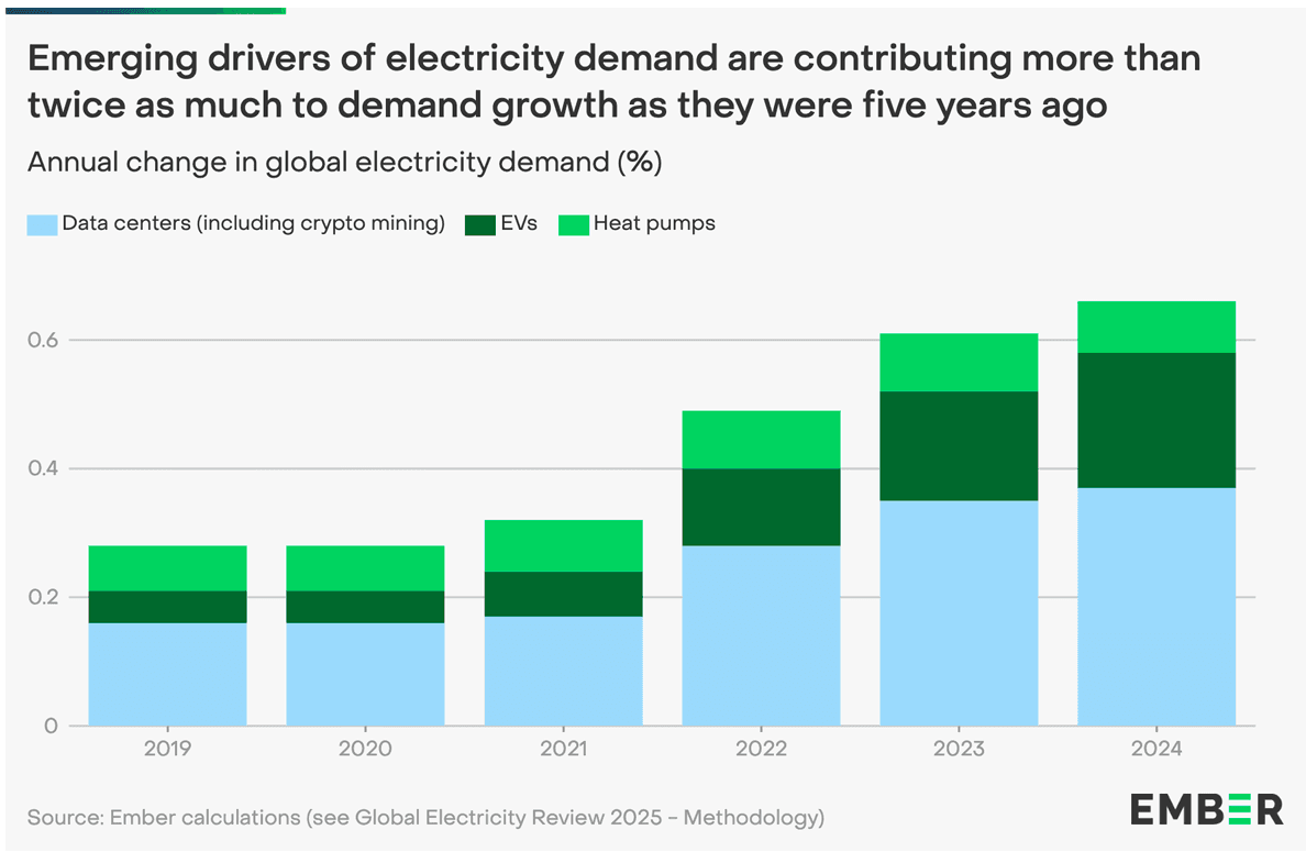 Men som allerede nevnt, etterspørselen etter elektrisitet øker uvegerlig. Drivere er ikke minst overgangen til elbiler, økningen i installeringen av varmepumper og stadig flere datasentre. For eksempel økte etterspørselen etter kraft til elbiler med 62 TWh – hele 38 prosent – i 2024. Det var opp fra 163 TWh i 2023 til 225 TWh i 2024.