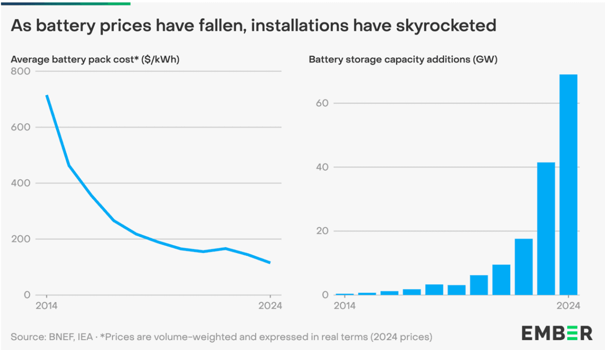 Blant annet derfor har også den årlige installasjonen av batterilagringskapasitet økt voldsomt, faktisk med en gjennomsnittlig fart på hele 67 prosent per år det siste tiåret.