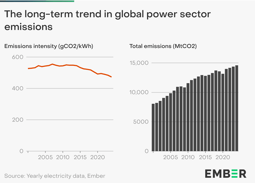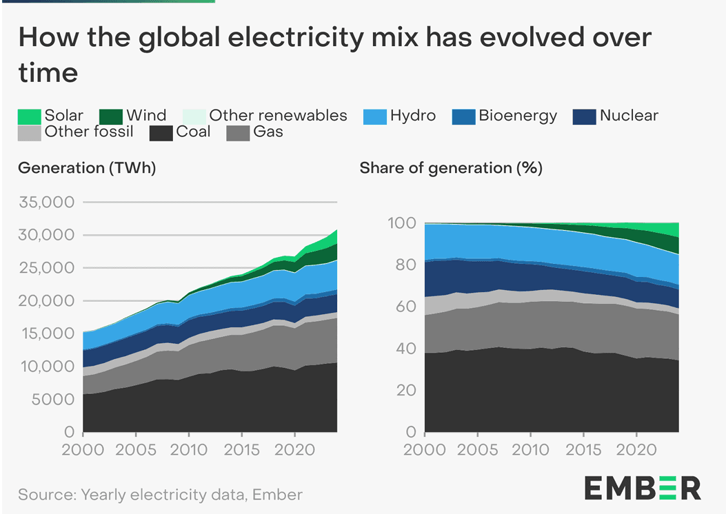 Som nevnt tidligere steg andelen utslippsfri energi (fornybar energi og kjernekraft) til 40,9 prosent av den globale elektrisitetsproduksjonen i 2024. Men forbruket av fossil energi til strømproduksjon økte også, selv om andelen altså sank til 59,1 prosent. Andelen kullkraft har falt betydelig, fra 40,8 prosent i 2007 til 34,4 i 2024, mest de siste ti årene. Andelen gasskraft har falt noe hvert år i fire år nå.