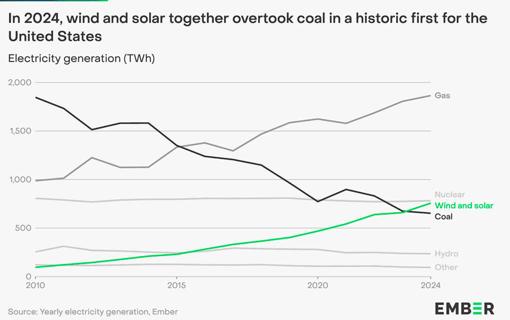 2024 var solens og vindens år i USA, gjennom året ble det for første gang produsert mer vind- og solkraft enn kullkraft. Solkraften økte med 64 TWh. Men etterspørselen etter strøm økte også med 3 prosent – ikke minst på grunn av hetebølgene, og dermed oppsto behovet for mer gasskraft.