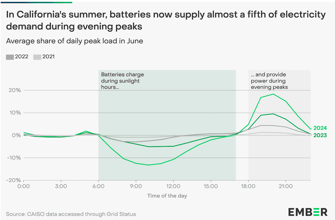 I California lagres nå såpass mye sol på batterier at det kan dekke nær en femtedel av kraftbehovet når etterspørselen er som høyest på kveldstid. Slik erstatter solenergi fossil gasskraft.