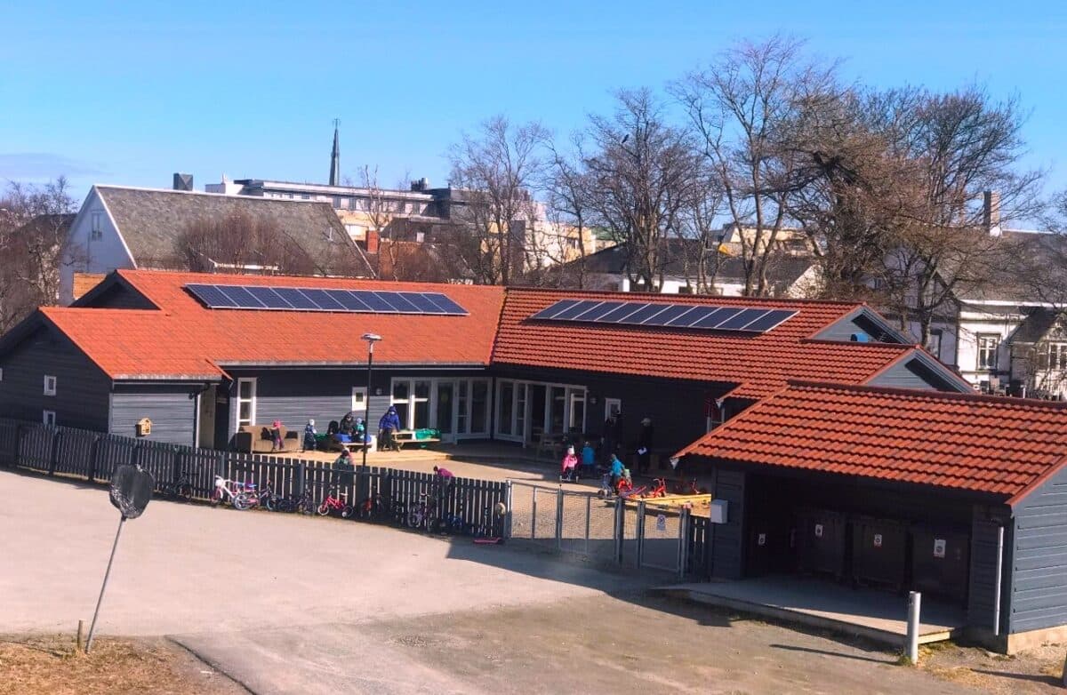 Mørkvedbukta skole og barnehage i Bodø har solceller på 589 m2 av taket. – Dette er det største anlegget vi kunne bygge uten at vi trenger konsesjon. Alt er gjort klart slik at solcelleanlegget kan dobles i størrelse så snart NVE endrer grensen på maksium 100 kW for plusskunder, sier energirådgiver Ole Arne Torsvik. (Foto: Anne Jortveit)