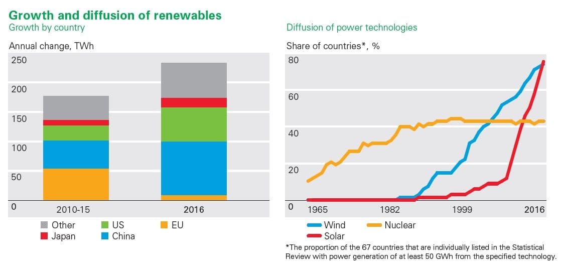 Veksten i solenergi har fått mye oppmerksomhet de siste årene. BPs tall viser hvordan spredningen (diffusjonen) av solenergi skiller seg fra andre energiteknologier. Vekstkurven er langt brattere enn for kjernekraft, og også brattere enn for vindkraft.