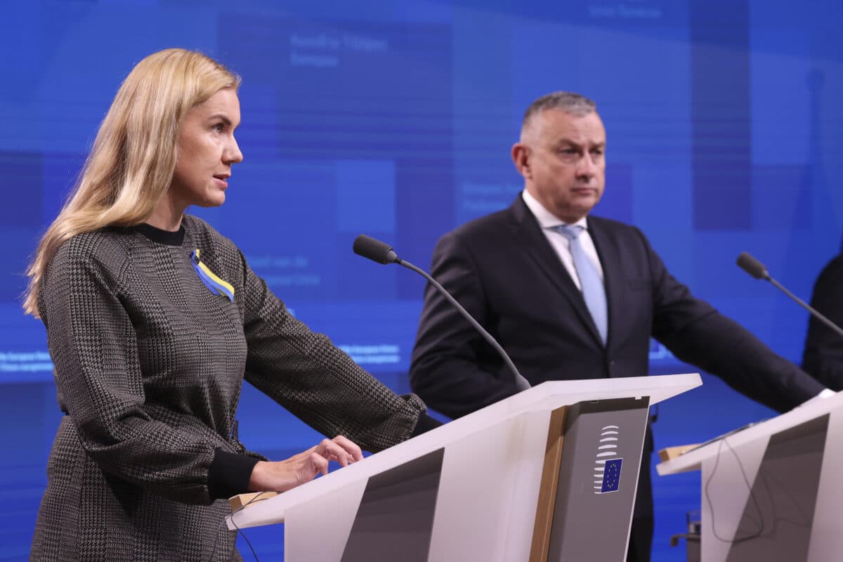 Energikommissær Kadri Simson og den tsjekkiske industri og enwergiminister Jozef Sikela på fredagens pressekonferanse. Foto: Rådets pressetjeneste