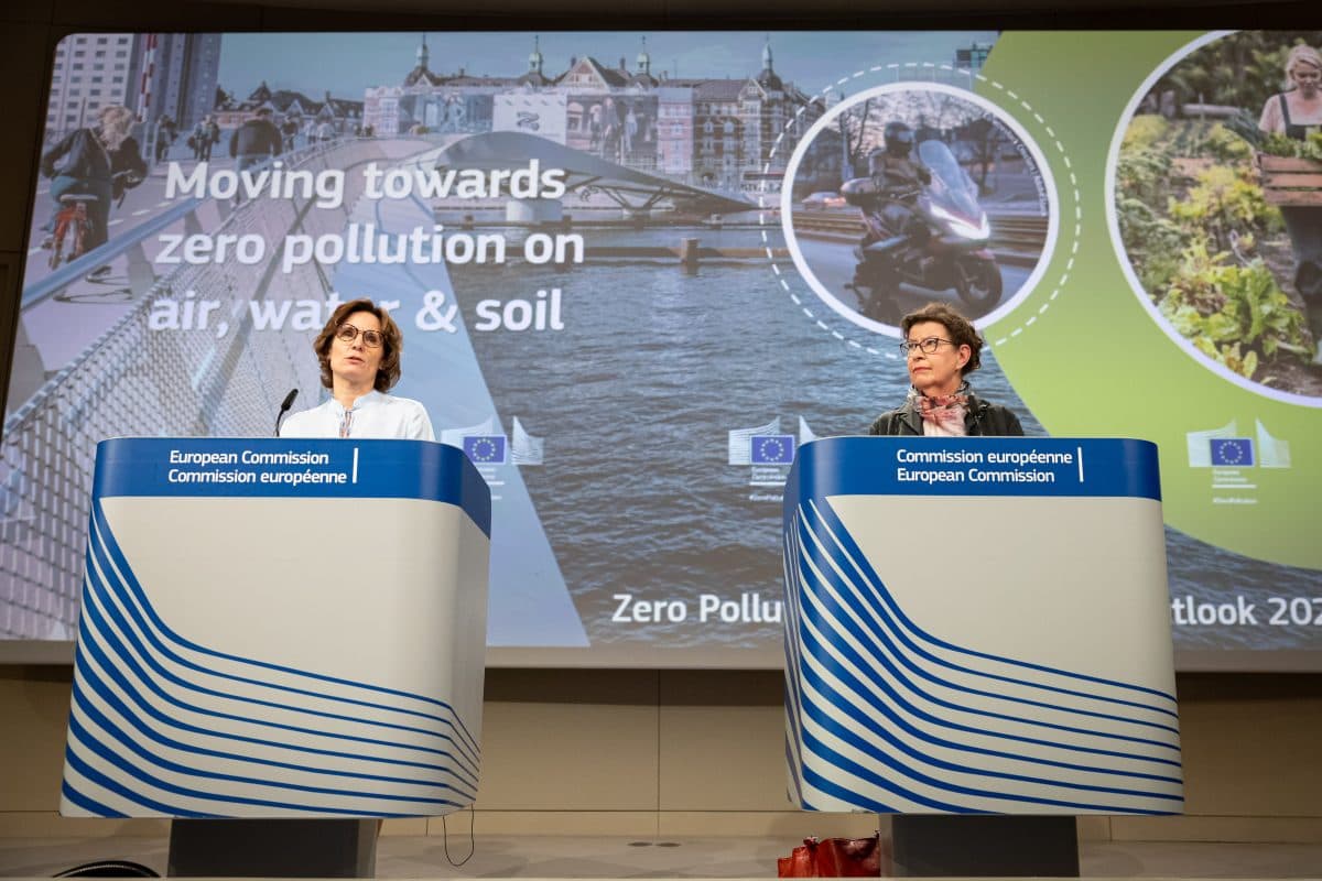 To foredragsholdere ved podier foran en skjerm som viser «Moving into zero pollution on air, water & soil» på et EU-kommisjonsarrangement.