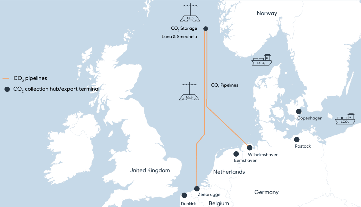 - EU2NSEA er et planlagt nettverk med rørledninger som skal koble nordeuropeiske land som Belgia og Tyskland med karbonlagere i norskehavet. Rørledningene skal ha en kapasitet på mellom 20 og 40 millioner tonn CO₂ i året, og vil strekke seg 900 kilometer fra Tyskland til Norskehavet. Det er Equinor som står bak prosjektet, i samarbeid med belgiske Fluxys og tyske Wintershall Dea. Equinor planlegger for at anlegget kan starte konstruksjon i starten av 2026 og bli operativt i løpet av 2029. Endelig investeringsbeslutning skal fattes innen slutten av 2025.
