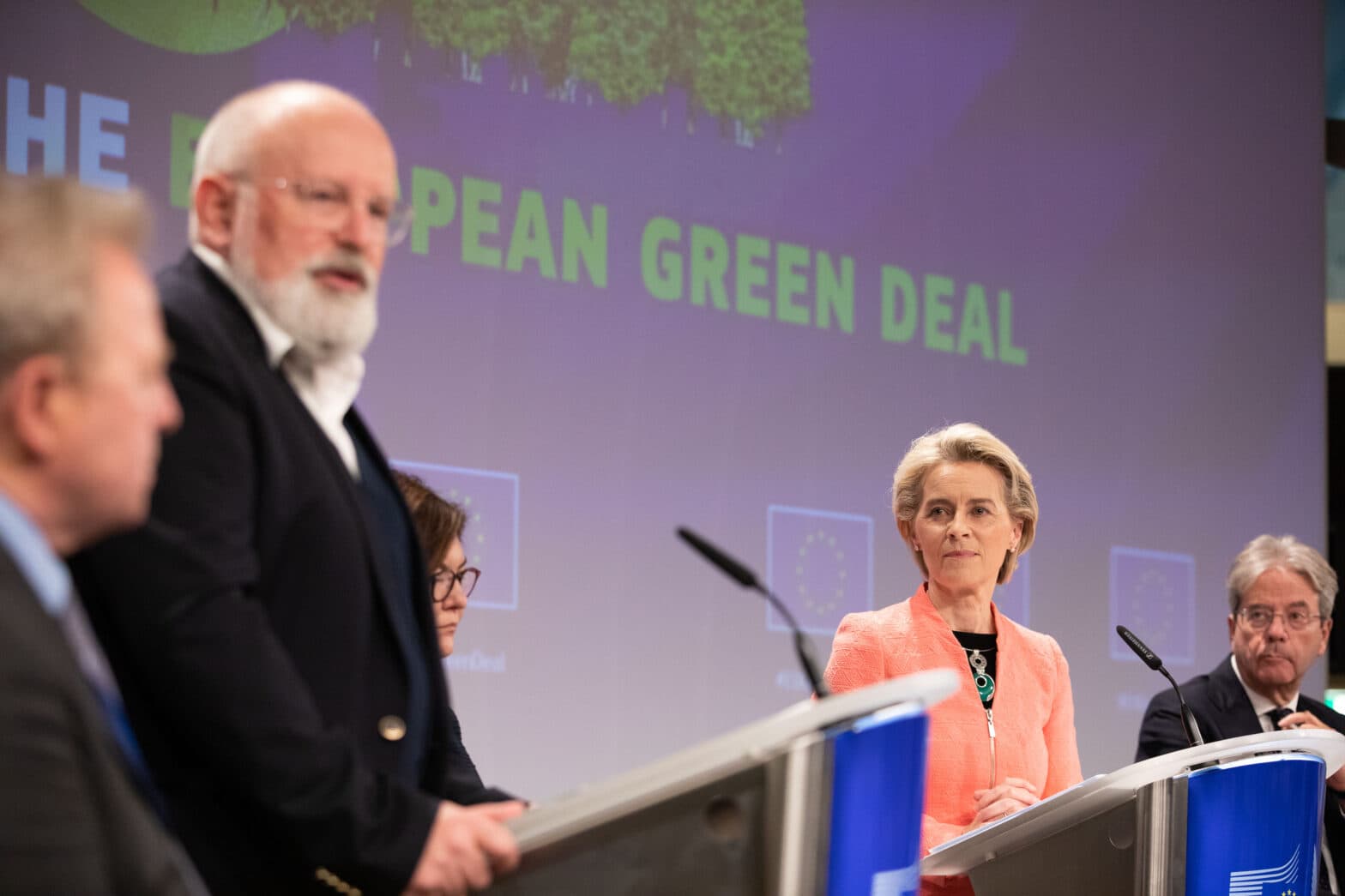 Den 14. juli 2021 la EU-kommisjonen frem den store lovpakken «fit for 55.» Nå er en rekke av lovene endelig vedtatt. Her fra presentasjonen, fra venstre kommissærene Janusz Wojciechowski, Frans Timmermans, Adina Vălean, EU-kommisjonens president Ursula von der Leyen og kommissær Paolo Gentiloni. Foto: EU-kommisjonen.