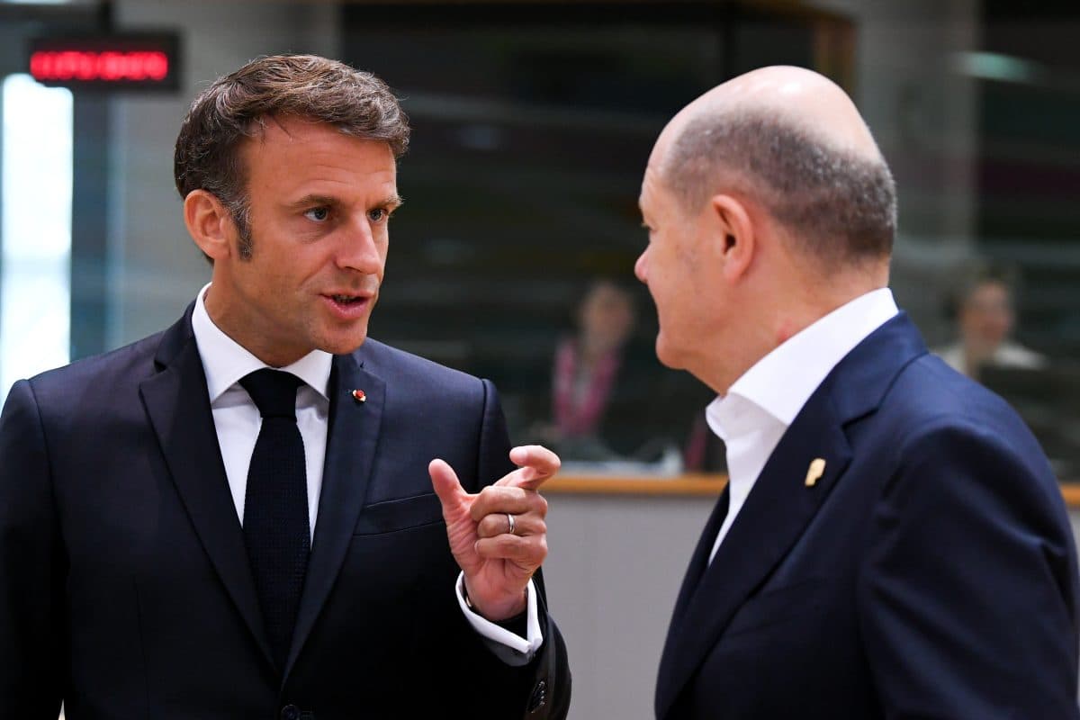Frankrikes president Emmanuel Macron. og forbundskansler Olaf Scholz står mot hverandre i spørsmålet om Mercosur-avtalen. Foto: Rådets prressetjeneste