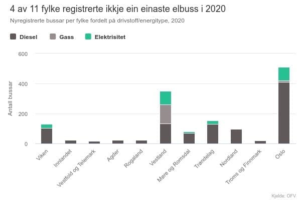 2020: Dieselbussen på topp i alle fylke, bortsett frå i Vestland