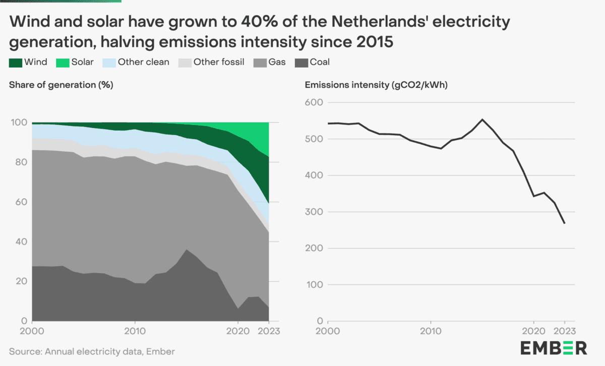 - Nederland har økt andelen vind og sol fra 8 prosent i 2015 til 41 prosent i 2023. Klimagassutslippene er ned 46 prosent siden 2015.