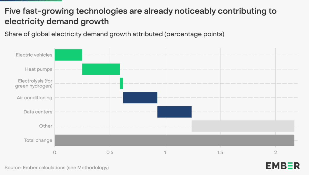 Fem hurtigvoksende teknologier sto for over halvparten av forbruksøkningen i 2023: Elektriske kjøretøy, varmepumper, elektrolysører for grønt hydrogen, datasentre og luftkjøling. Strømforbruket fra datasentre har økt med nesten 17 prosent årlig siden 2019. Dersom det ikke investeres i mer effektiv kjøling, kan strømforbruket fra sektoren nesten doble seg til 1050 TWh innen tre år, ifølge Det internasjonale energibyrået. De beste kjølesystemene kan forbedre energieffektiviteten i datasentre med minst 20 prosent, skriver Ember.