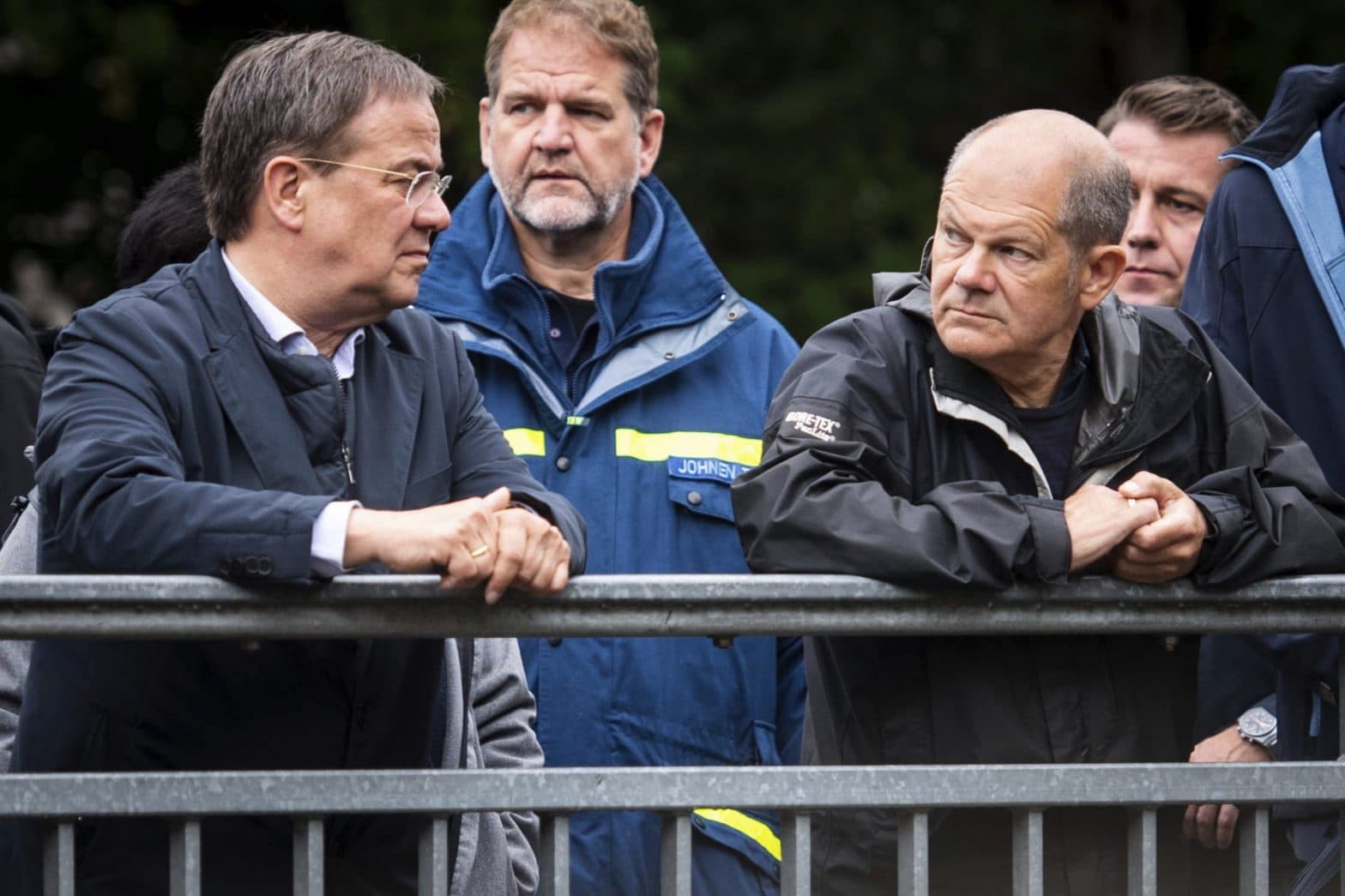 Armin Laschet (CDU, til v.) og Olaf Scholz (SPD) kjemper om å bli Tysklands neste forbundskansler, med Scholz i teten i målingene. Her er de under et besøk i flomrammede Vichtbach 3. august. (Foto: Marius Becker, DPA via AP/NTB)