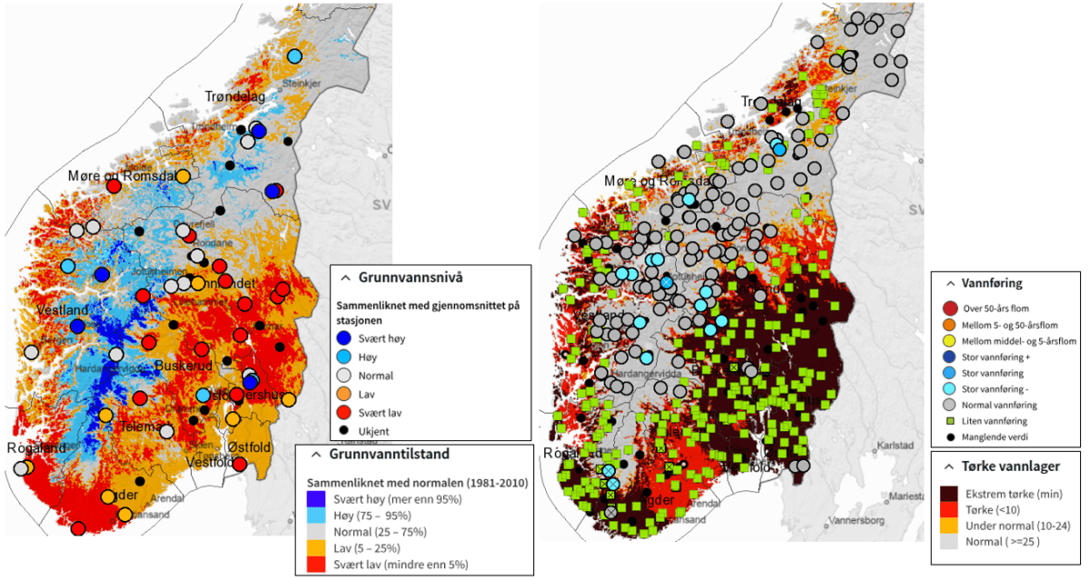 Uvanlig lite vann: NVE overvåker tørketilstanden i Norge, i utgangspunktet med egne data, forteller spesialrådgiver og hydrogeolog Hervé Colleuille til Energi og Klima. Hovedkildene er målinger av grunnvannstand ved om lag 60 stasjoner, og målinger av vannføring i elver med 500 målepunkter. I tillegg bruker NVE hydrologiske modeller til blant annet å beregne en tørkeindeks for de nærmeste ni dager som er basert på værprognoser fra Meteorologisk institutt.