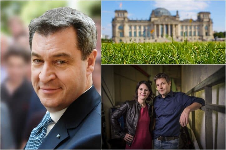 Et realistisk scenario: CDU/CSU med Markus Söder i spissen (til v.) regjerer sammen med De Grønnes lederduo Annalena Baerbock og Robert Habeck etter høstens valg til Forbundsdagen. (Foto Söder: CSU. Baerbock/Habeck: Dominik Butzmann, gruene.de. Bundestag: Lars Steffens – CC: by-sa).