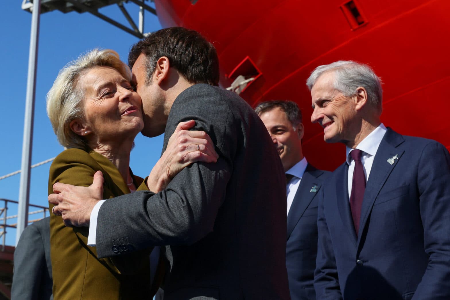 Fra havvindtoppmøtet i Oostende 24. april – EU-kommisjonens leder Ursula von der Leyen og Frankrikes president Emmanuel Macron, statsminister Jonas Gahr Støre følger med. (Foto: Yves Herman/Reuters/NTB)