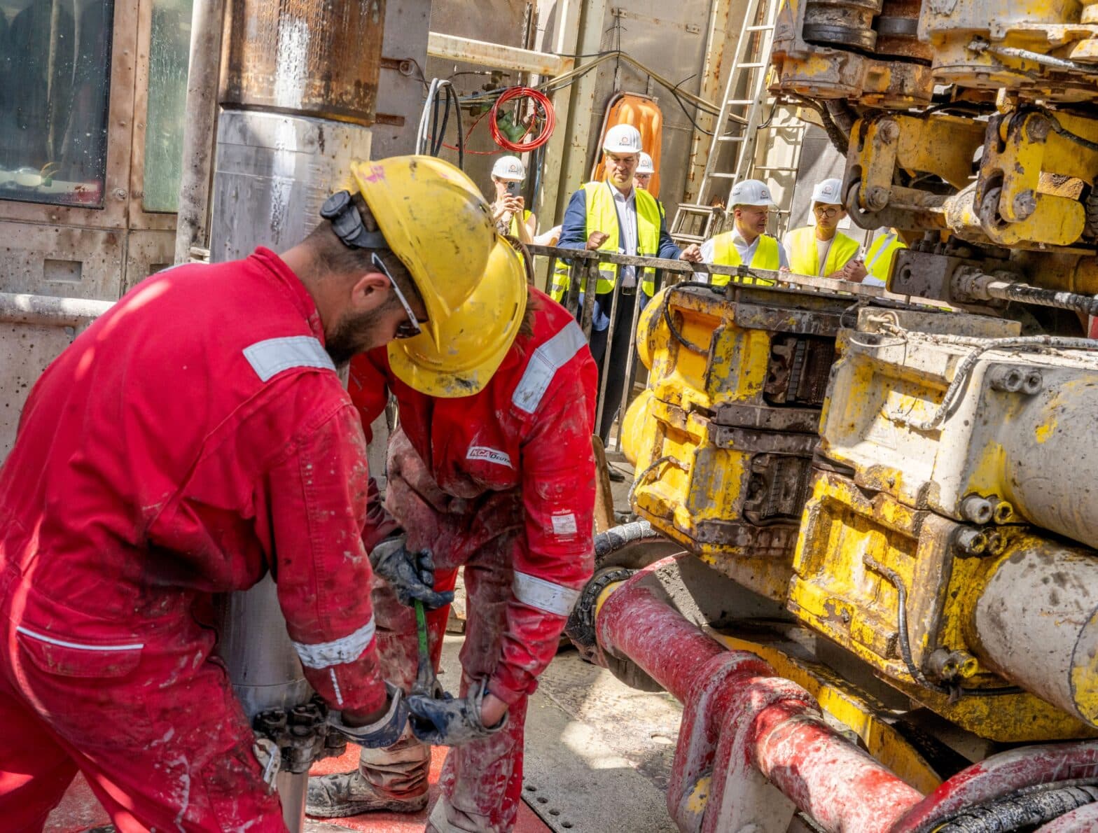 Fikser vi det grønne skiftet, folkens? Tysklands forbundskansler Olaf Scholz (i midten bak) på besøk hos et selskap som borer etter geotermisk energi i Geretsried i Bayern 24. august. (Foto: Peter Kneffel/Pool via Reuters/NTB).