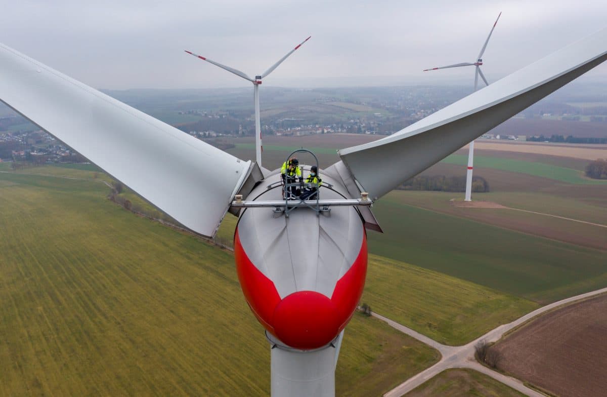Vedlikehold på vindturbin i Bernsdorf i den tyske delstaten Sachsen. Tyskland og EU må investere stort i energiomstilling det neste tiåret. (Foto: Jan Woltas/dpa/AP/NTB).