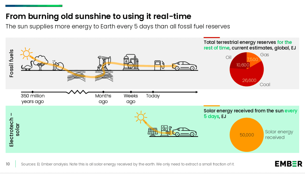 Et av hovedpoengene i Ember-rapporten er den evigvarende, enorme tilgangen til solenergi som gir oss umiddelbar energi uten dyre mellomledd. (Figur: Ember.)