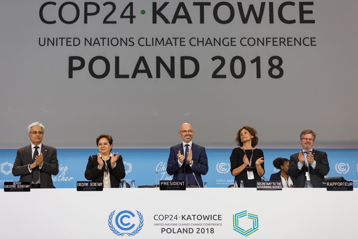 Applaus for enighet på klimatoppmøtet i Katowice. I midten møtets president Michal Kurtyka. Til venstre for ham FNs klimasjef Patricia Espinosa.