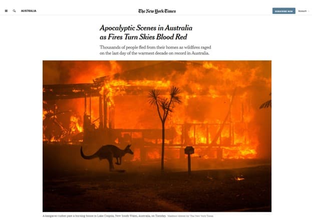 Tørke. Unormalt høye temperaturer. Ikke regn. Katastrofen som utspiller seg i Australia viser at klimaendringene er her. Titusenvis av mennesker evakueres. Brannmenn kjemper for å dempe skadene. De menneskelige og økonomiske tapene er store. Daily Mail oppsummerer slik: 17 døde, 18 savnede, 1400 hjem ødelagt, 5 millioner hektar brent – og 500 millioner dyr døde.