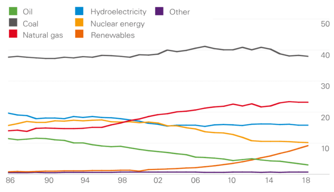 kommer fremdeles mesteparten av kraftproduksjonen fra kull, med 38 prosent.