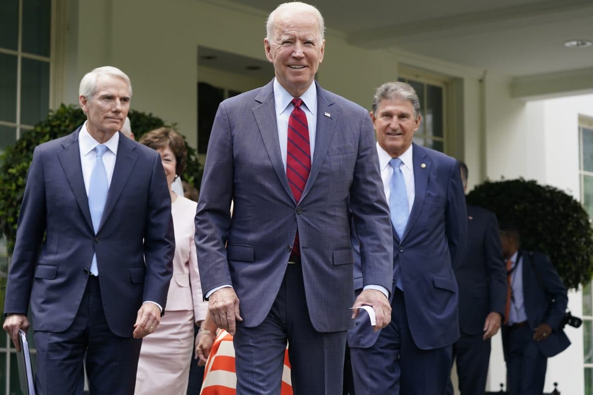 President Joe Biden flankert av de republikanske senatorene Rob Portman og Susan Collins og Bidens partifelle, senator Joe Manchin (bak til høyre). Manchin holder nøkkelen til om Bidens klimapolitikk vil lykkes. Men han må overtales ganske raskt. Foto: NTB / AP Photo / Jacquelyn Martin