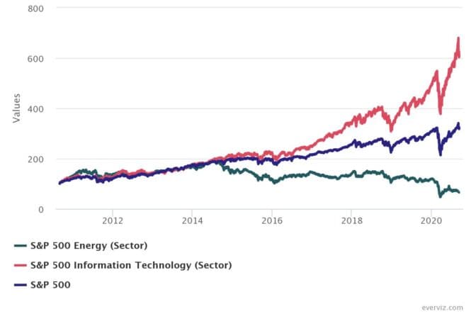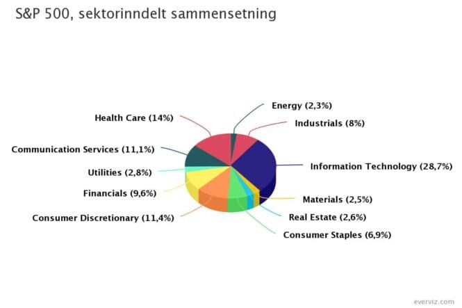 Bakgrunn: S&P 500-indeksen består av 500 av de største børsnoterte selskapene i USA og er delt inn i elleve sektorer, fordelt etter bransjetilhørighet. Etter et akselerert fall under pandemien, er energiselskapene den minste sektoren målt i verdi, skriver Washington Post.