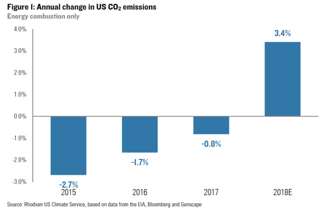 USA slapp ut meir CO₂:Etter tre år med nedgang gjekk CO₂-utsleppa i USA opp med 3,4 prosent i 2018. Det viser førebelse utrekningar gjort av det uavhengige analyseselskapet Rhodium Group. Utsleppa auka i alle sektorar. Hovudforklaringa er den sterke økonomiske veksten og fleire kuldedagar. Dette bidrog mellom anna til kraftig auke i elektrisitetsforbruk generelt og gasskraft spesielt. At kolkraftverk med over 11 GW i samla kapasitet blei stengd ned var ikkje nok til å redusere sektorens CO₂-utslepp. (Til og med i California gjekk utsleppa frå kraftproduksjonen opp.) Dei to sektorane med størst utsleppsvekst i 2018 var bygg og industri. Veksten i direkte utslepp frå bruk av olje, diesel og gass i amerikanske bustadar og næringsbygg gjekk opp med heile 10 prosent frå 2017-2018. Utsleppa frå industrien gjekk opp 5,7 prosent. Til New York Times seier ein analytikar i Rhodium Group at det viktigaste ein kan trekke ut av 2018-tala er at USA enno ikkje har klart å kople utsleppsvekst frå økonomisk vekst. Same utsleppsutvikling som den Rhodium Group publiserte denne veka blei varsla før jul av Global Carbon Project(dei anslo vekst på 2,5 prosent). Begge trur at dei amerikanske CO₂-utsleppa vil gå ned igjen i 2019.