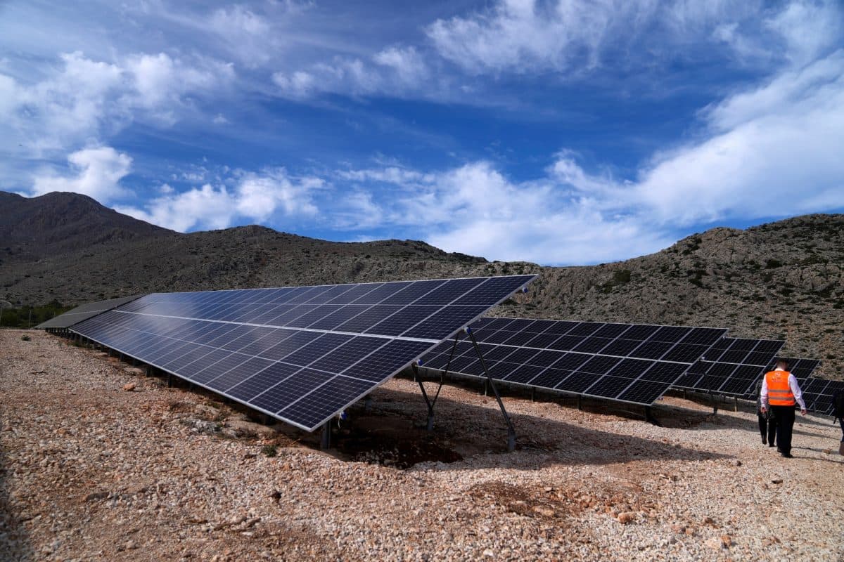 Solcellepaneler i et nytt produksjonsanlegg på den lille øya Chalki i Egeerhavet. Chalki fremstilles som Hellas’ første øko-øy, der solcellene skal dekke innbyggernes kraftbehov. (Foto: Thanassis Stavrakis/AP/NTB)