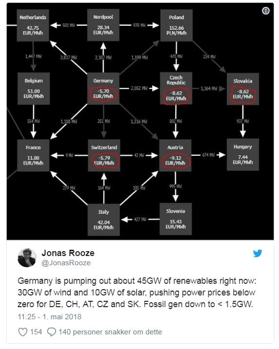 Men de tyske kull- og kjernekraftverkene responderer ikke på den høye fornybarproduksjonen ved å skru av sin produksjon. Kraften fra lite fleksible kull- og kjernekraftverk eksporteres, noe som betyr at mange av nabolandene opplevde negative strømpriser den 1. mai. I både Sveits, Østerrike, Tsjekkia og Slovakia var strømprisene negative. Se tweeten fra Jonas Rooze, som leder analysearbeidet om de europeiske kraftmarkedene i Bloomberg New Energy Finance.