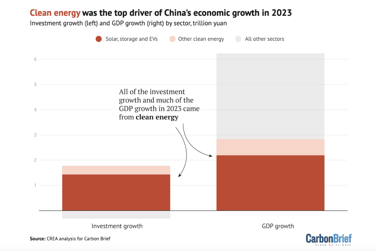 Ren energi var ikke bare ansvarlig for økningen i investeringer (investeringer i alle andre sektorer falt), men også det viktigste bidraget til Kinas økonomiske vekst, med en andel på 40 prosent av økningen på tvers av sektorer, skriver Carbon Brief.