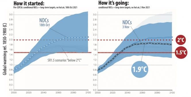 Det konkluderer Climate Resource i ein analyse av dei oppdaterte nasjonale klimalovnadene som har blitt meldt inn før og under COP26. På «stammespråket» går desse lovnadene under forkortinga NDCs (Nationally Determined Contributions). Før COP26 vurderte UNEP effekten av dei då innmeldte NDC´ane til minst 2,7 gradars oppheting.