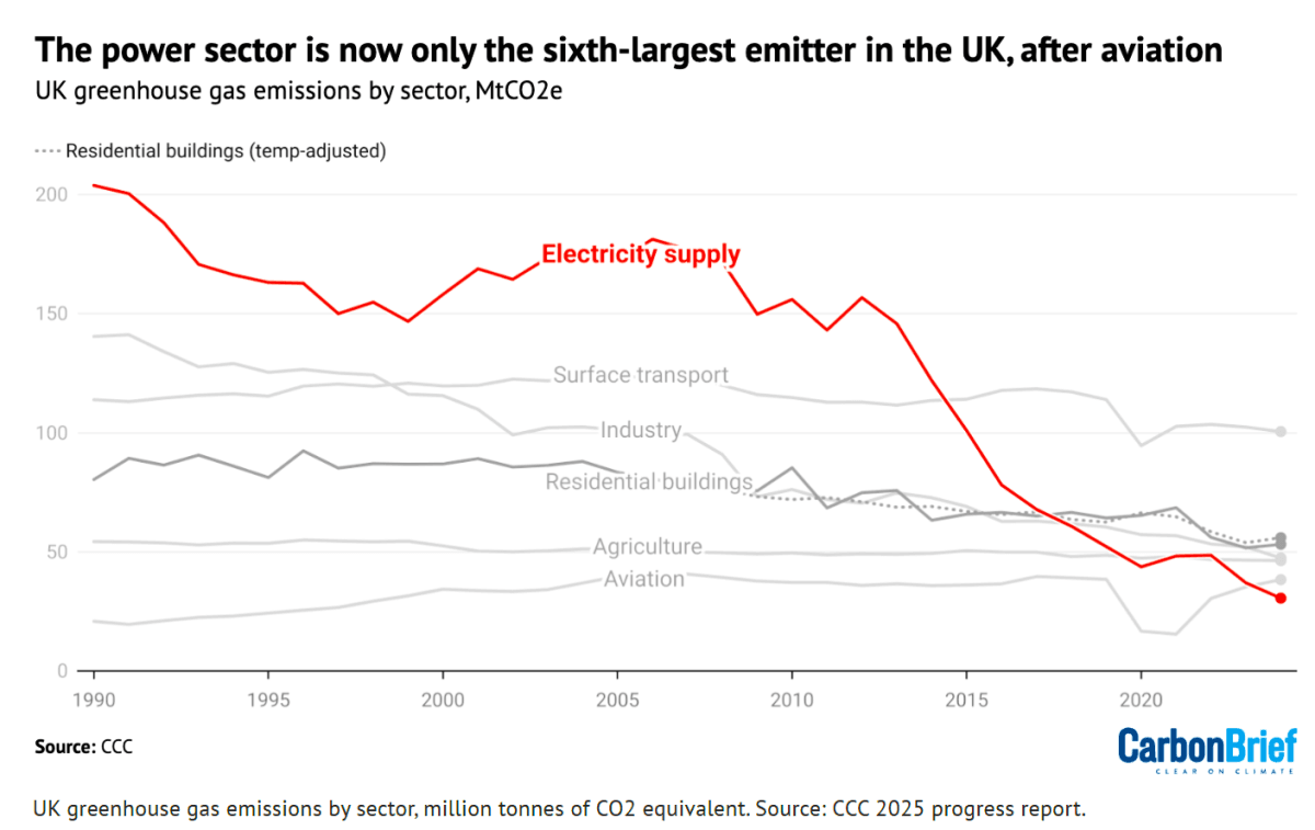 - Storbritannias totale utslipp gikk i 2024 ned med 2,5 % fra 2023. Nedgangen skyldes lavere utslipp fra industri og strømforsyning, – landets siste kullkraftverk stengte i oktober 2024. Utslippene fra fly økte og holdt kuttene nede. (Se grafen under fra Carbon Brief.)