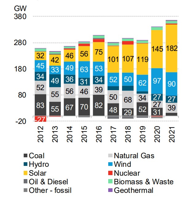 Solenergi bidro med rundt 50 prosent av hele den globale økningen i kraftkapasiteten i 2021. Det skriver nettsiden PVTECH (og med henvisning til BloombergNEF – BNEF – og en rapport som ligger bak betalingsmur). Alt i alt ble det i 2021 installert 182 GW solenergi, en økning på 25 prosent fra 2020. I nesten halvparten av landene BNEF undersøkte var det solenergi som sto for det største kapasitetsvolumet, inkludert de største markedene som USA, India, Kina, Brasil og Australia. I 2021 var det 112 land som installerte mer enn 1 MW solenergikapasitet, mot 101 markeder i 2020. «Fornybar energi er nå standardvalget for de fleste land som ønsker å legge til eller til og med erstatte kraftgenererende kapasitet," sier Luiza Demôro, leder for energiomstilling i BloombergNEF.