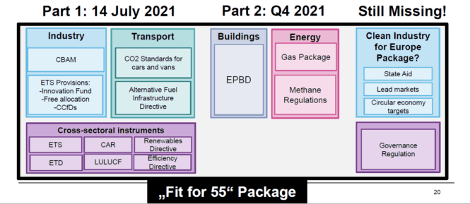 Pakken av lovforslag - kalt "Fit for 55" etter 2030-målet om minst 55 prosent utslippskutt - er hovedgrepet EU tar for å følge opp enigheten om klimamålet. Pakken inneholder en omfattende endring av mange av EUs lover og regler på klima- og energifeltet, og har lenge vært under utarbeidelse som del av EUs grønne giv (Green Deal).