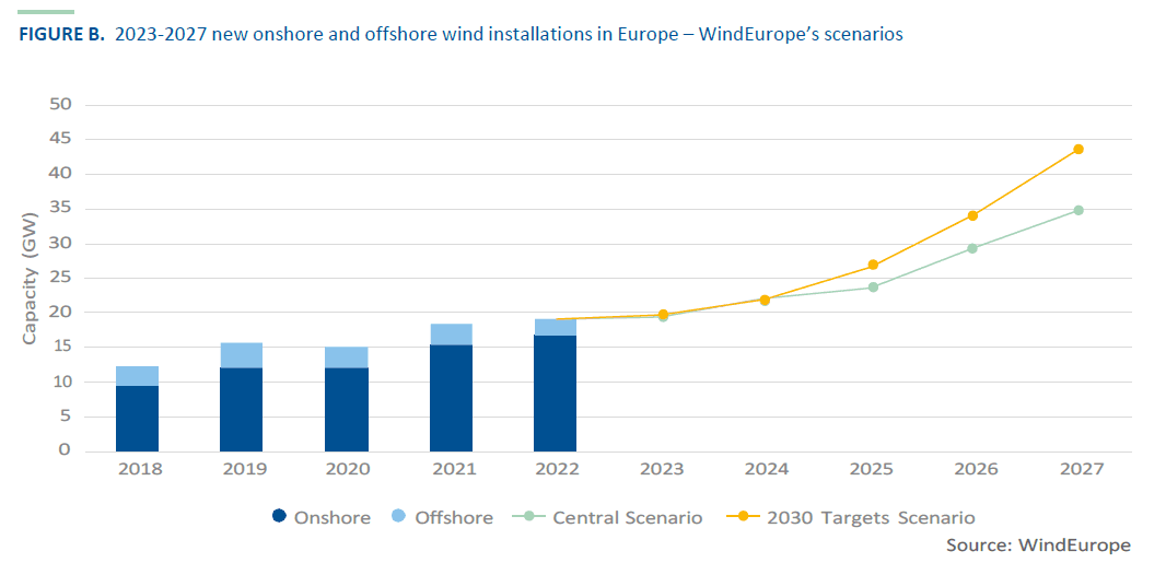 Totalt vil det bli bygget ut 129 GW i Europa i perioden 2023–27, viser Wind Europes hovedscenario. I EU vil det bli bygget 98 GW, det vil si 19,6 GW i snitt hvert år.