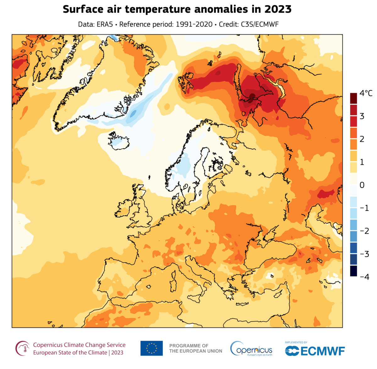Gjennomsnittstemperaturen i Europa i 2023 ble målt til 2,6 °C over nivået i førindustriell tid. Det gjorde fjoråret til det varmeste som er målt, sammen med 2020. Nesten hele Europa hadde temperaturer over gjennomsnittet for tredveårsperioden 1991-2020. Skandinavia, Island og det sørøstlige Grønland var unntak.