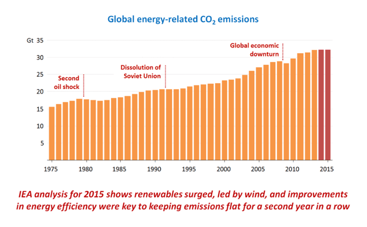 Det internasjonale Energibyrået har nå lagt frem tall som viser at klimautslippene ikke økte i 2015. Tallene for fjoråret viser samme trend som i 2014: De siste tre årene har de globale CO₂-utslippene praktisk talt stått stille, tross betydelig økonomisk vekst.