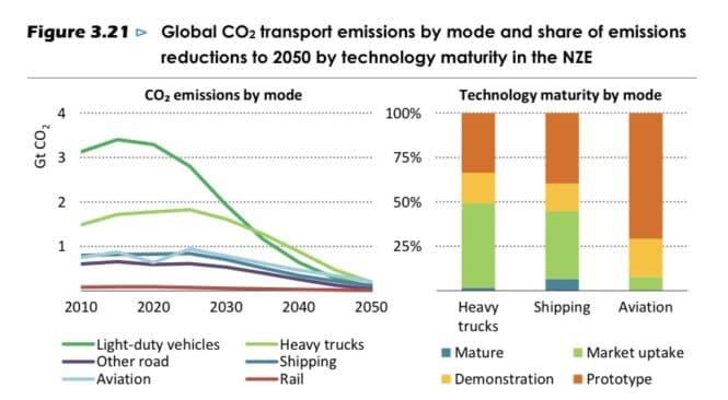 Mange av teknologiene som trengs for å kutte utslipp innen langdistansetransport er fortsatt under utvikling. Derfor vil det ennå være noe utslipp fra disse typene transport i 2050. Utslipp fra persontransport på to og tre hjul vil være nesten borte i 2040, fra biler, varebiler og tog mot slutten av 2040-tallet.