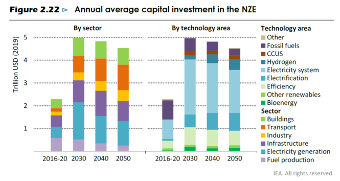 Den radikale omstillingen av det globale energisystemet avhenger av en stor økning i investeringsnivået - og et markant skifte i hva pengene investeres i. IEAs scenario forutsetter en økning i årlige investeringer i energi fra om lag 2 billioner dollar i dag til nesten 5 billioner dollar i 2030. Størstedelen brukes på kraftproduksjon, kraftnett og elektrifisert utstyr innen transport, oppvarming og industri.
