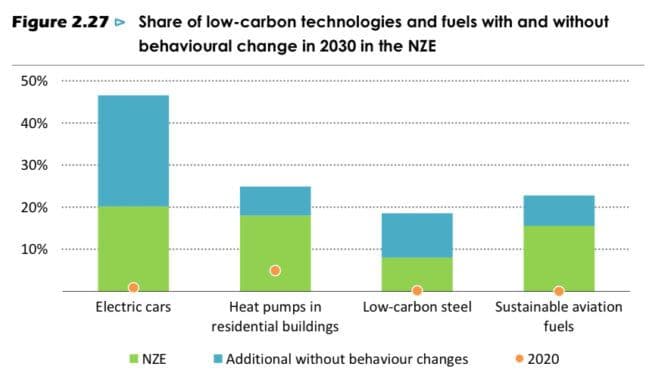 Endringer i atferd reduserer global etterspørsel etter energi med 10 prosent i 2050 i IEA-scenarioet. Endret atferd betyr særlig mye i transportsektoren. Eksempler: Reduksjon i flyreiser, blant annet ved overgang til tog der det er mulig. Redusert bilbruk i byer. IEA skisserer en rekke tiltak som produktstandarder og veiprising for å påvirke atferd.