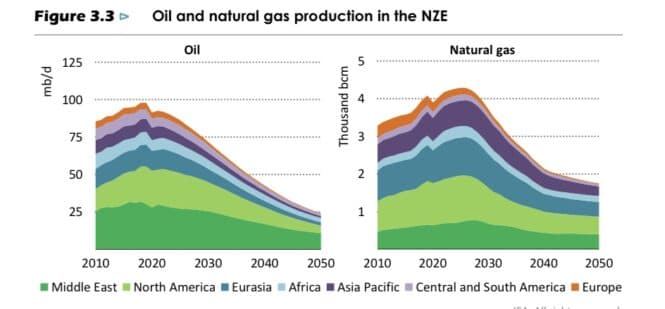 Forbruket av fossil energi faller dramatisk i netto null-scenarioet. Kullforbruket er 90 prosent lavere i 2050 enn i 2020. Etterspørselen etter olje faller 75 prosent i perioden. Gassforbruket vokser noe de neste årene og når toppen på midten av 2020-tallet, før det begynner å falle. I 2050 er gassforbruket 55 prosent lavere enn i 2020.