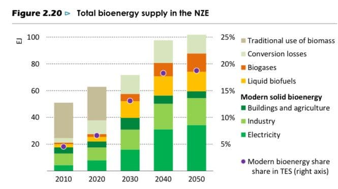 Produksjonen fra det IEA kaller moderne bioenergi, som inkluderer biogass, flytende biodrivstoff og moderne biomasse fra bærekraftige ressurser, øker fra i underkant av 40 EJ i 2020 til rundt 100 EJ i 2050. Den kraftige veksten til tross: IEAs anslag for fremtidig bioenergiproduksjon er betydelig lavere enn det man finner i de fleste av scenarioene til FNs klimapanel.