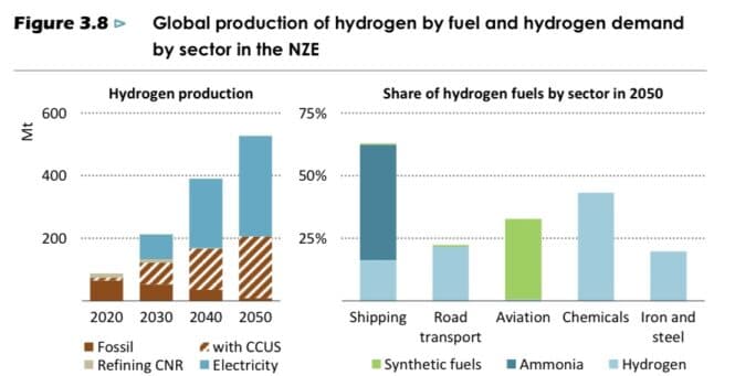 IEA gir hydrogen en stor rolle i netto null-scenarioet. Etterspørselen vokser til 530 millioner tonn i 2050, seks ganger dagens nivå. Halvparten går til bruk i tungindustri, særlig stål og kjemisk, og i transport. 30 prosent konverteres til andre hydrogenbaserte drivstoff - ammoniakk, syntetisk drivstoff for luftfart.