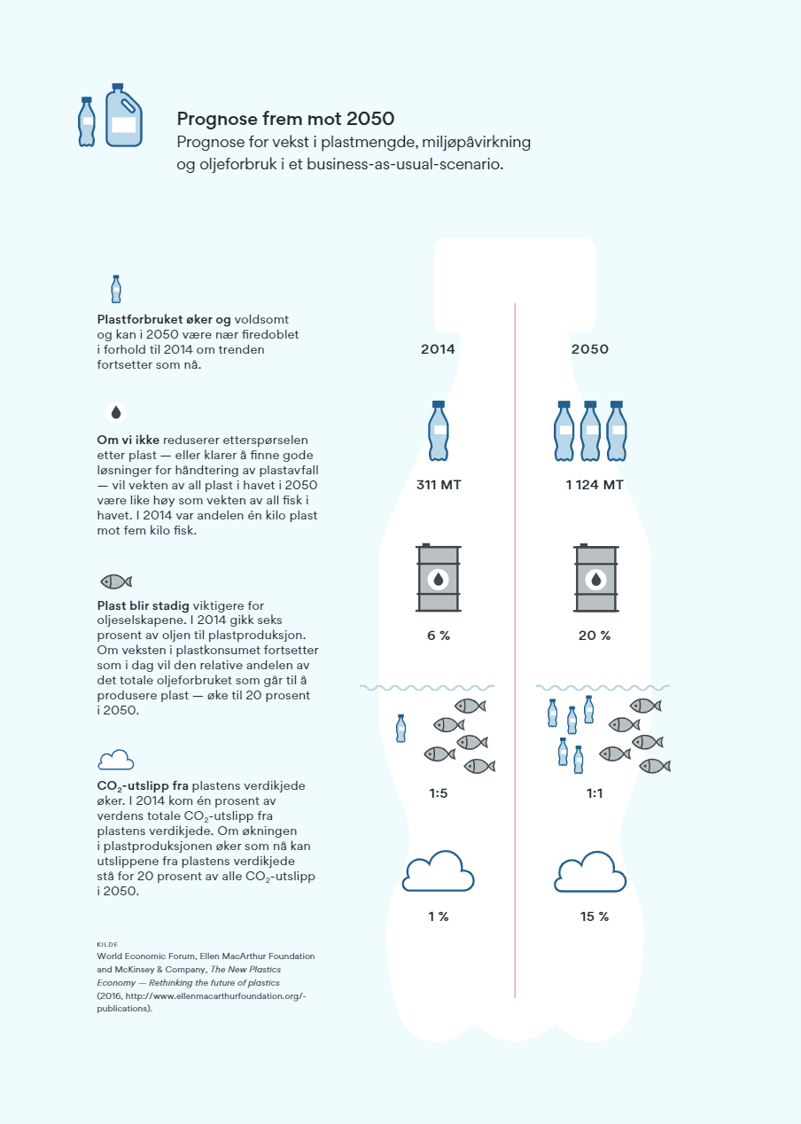 Teknologisk utvikling, prisfall og politikk har bidratt til at vi kan ha håp om konkurransedyktige alternativer til de gamle fossile løsningene – utslipp knyttet til transport og kraftproduksjon vil derfor etter hvert nå en topp og deretter synke utover på 2020‐, 2030‐ og 2040‐tallet. For plasten er det ikke like mye løfterikt på gang. Forbruket vokser i rekordfart – utfordringer knyttet til miljø og klima øker.