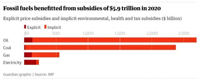 For å nå Parismålene om å begrense temperaturstigningen med maks 1,5 grader, trengs enorme mengder kapital ikke minst til ny fornybar kraftproduksjon. Men selv om det bare er 29 år til 2050, går mange incentiver og store summer fremdeles i feil retning. Det internasjonale pengefondet, IMF, har nylig lagt fram en rapport om at produksjon og bruk av olje, kull og gass ble subsidiert med 5,9 billioner dollar i 2020. Det skriver The Guardian. Eksplisitte subsidier – som reduserte drivstoffpriser – utgjorde 8 prosent av totalen. Skattelettelser ytterligere 6 prosent. Så har det internasjonale pengefondet beregnet at det at forurensere slipper å betale for skader som dårlig helse og dødsfall forårsaket av luftforurensning utgjør 42 prosent av beløpet. Kostnader knyttet til hetebølger og andre dyre konsekvenser av den globale oppvarmingen sto for 29 prosent av totalen. (Se graf under.)