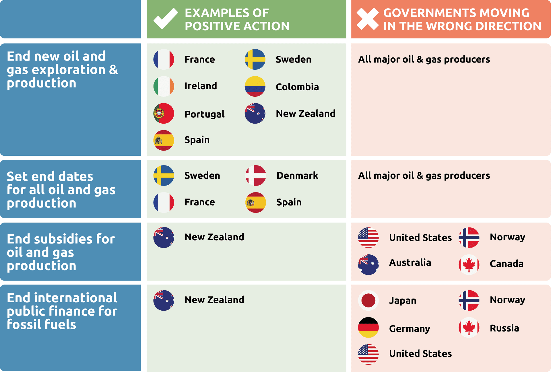 Store olje- og gassprodusenter som USA, Canada, Norge og Australia har et klart ansvar for å gå foran med å sette en sluttdato for olje- og gassproduksjonen, mener CAT. Tvert imot planlegger alle disse landene å øke produksjon og eksport av fossil energi. Til nå har bare land med liten produksjon satt sluttdato, som Frankrike, Spania og Danmark.