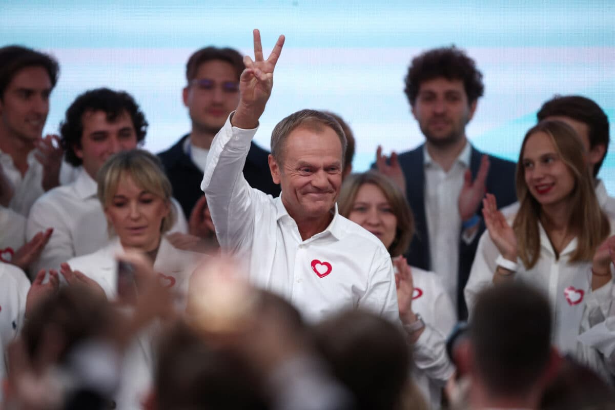 Opposisjonsleder i Polen Donald Tusk jubler på valgvake i Warszawa 15. oktober. (Foto: Kacper Pempel/Reuters/NTB)