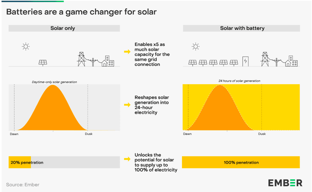 For å levere nok solstrøm gjennom et helt år har Ember regnet ut at 6 GW med solpanel i kompaniskap med 17 GWh batterikapasitet kontinuerlig kan levere 1 GW elektrisitet 97 prosent av året.